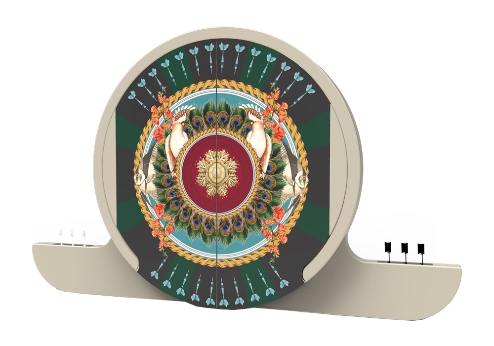 Darts cabinet set disegnato da Vismara Design è un armadietto per freccette con bersaglio. Freccette in sisal africano, mobile in legno laccato, porta freccette in acciaio, inclusi due set di freccette punta in acciaio. Ante disponibili in Circus Edition.