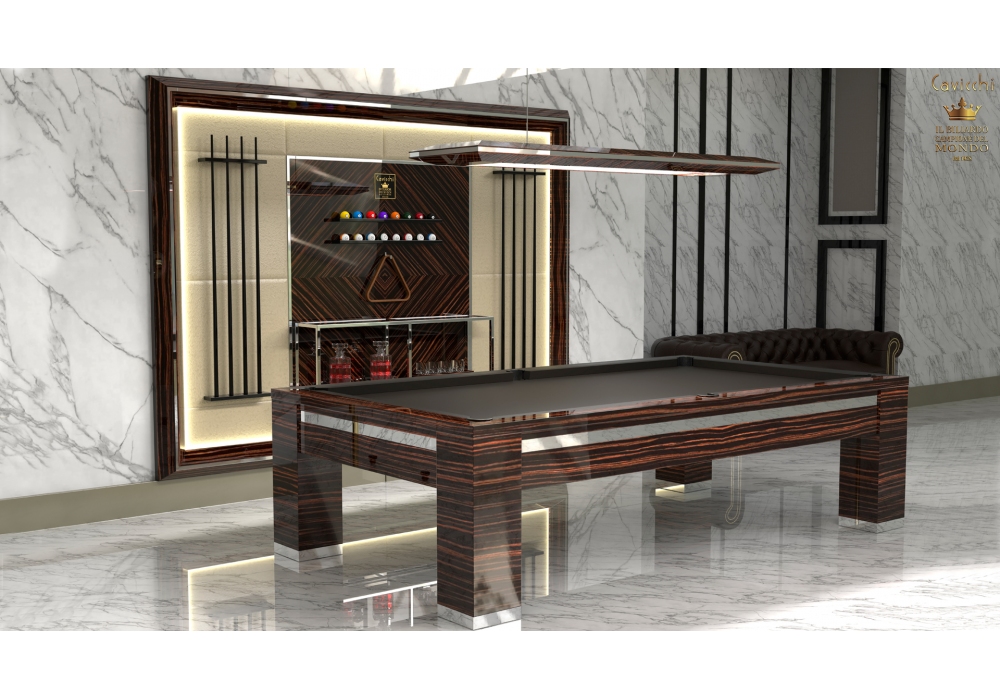 Cayman firmato da Cavicchi è un tavolo da biliardo caratterizzato da rivestimenti mediante l’utilizzo di legni pregiati tipo Ebano Makassar, Zebrano, Wenghè, Noce Canaletto, Rovere oltre a speciali laccature come il Perlato. Dimensioni e finiture esclusive su richiesta.