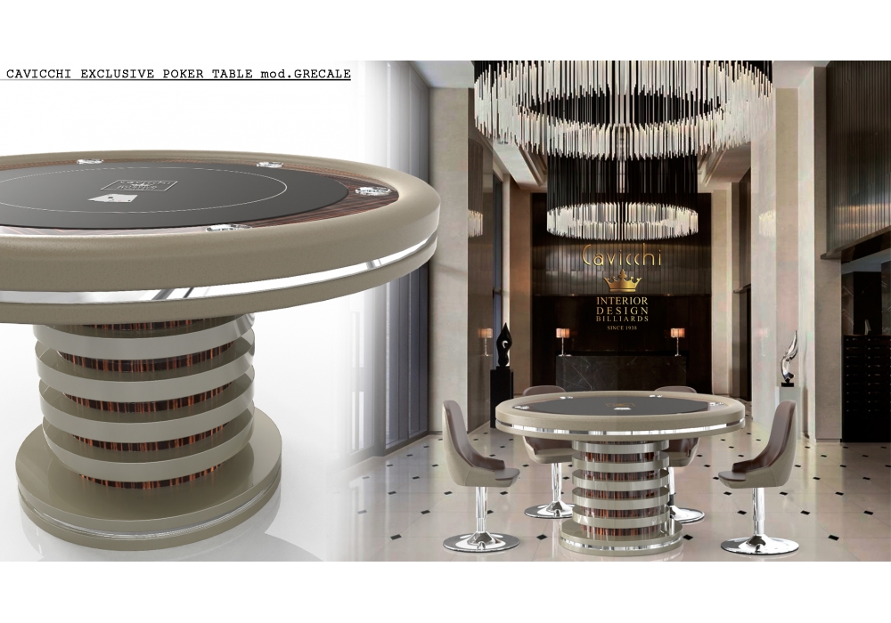 Grecale firmato da Cavicchi è un tavolo da poker, il piano da gioco circolare, completamente foderato sul bordo, si erge sul raffinato basamento a torre dove si alternano appositi dischi rifiniti in essenze pregiate e laccature. Differenti finiture disponibili su richiesta.