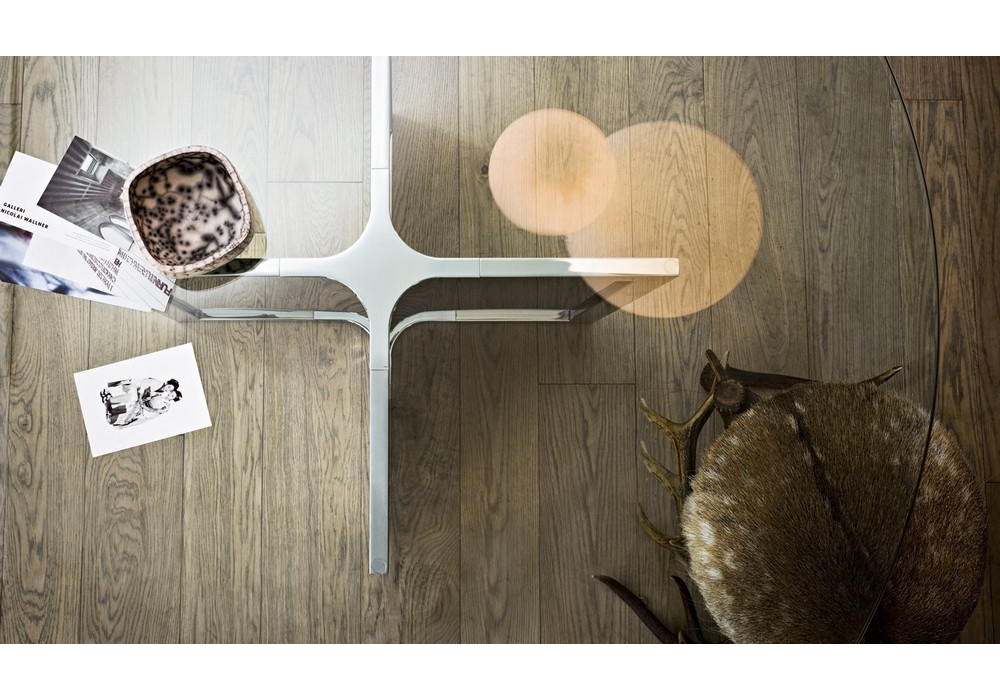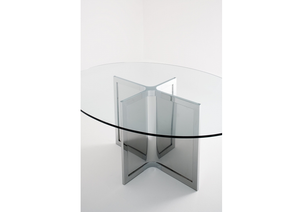 Raj 4 firmato da Ricardo Bello Dias per Gallotti&Radice è un tavolo mono base con giunto centrale in alluminio cromato a 4 vie e piano in cristallo trasparente 15mm. Struttura in acciaio inox lucido completa con pannellatura in lastra d‘acciaio lucido.