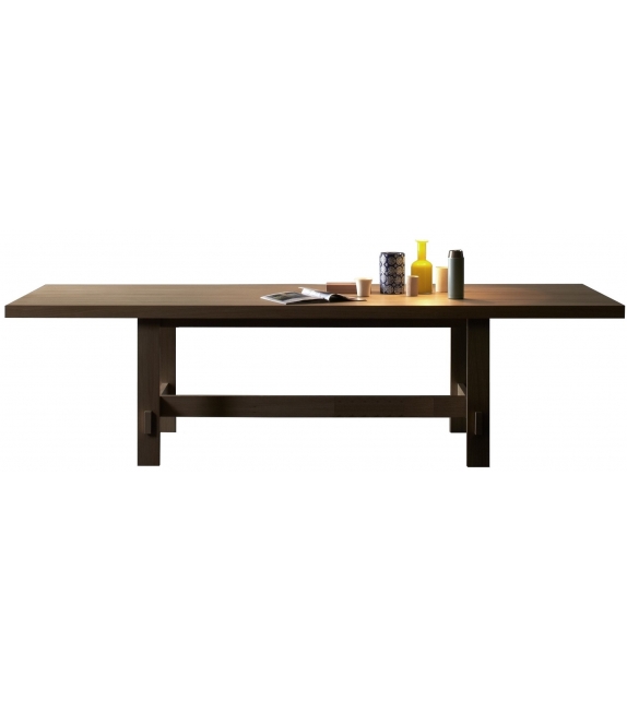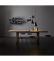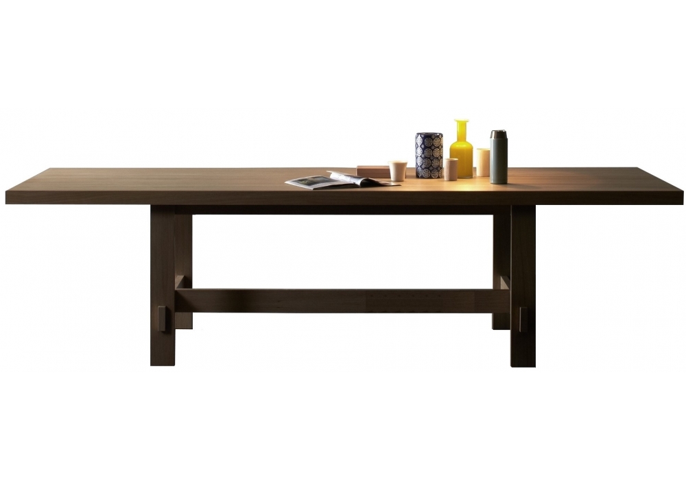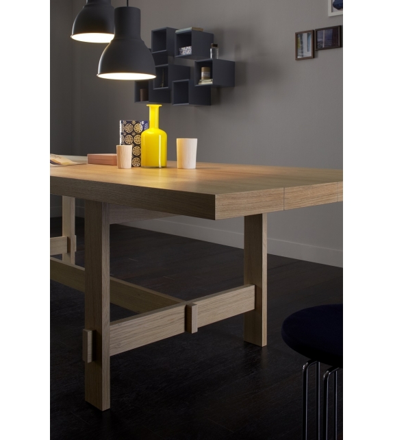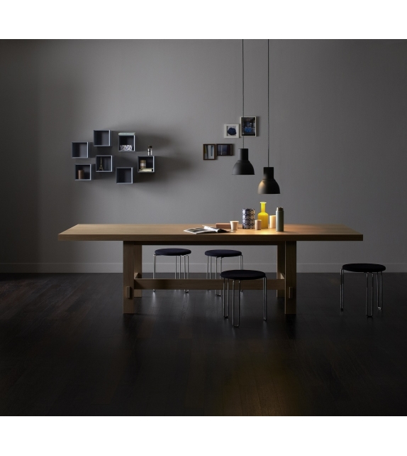 Share firmato da Silvano Pierdonà per Capodopera è un tavolo con piano caratterizzato da pannelli in tamburato e gambe in pannelli in legno impiallacciato in differenti finiture. Disponibile in due dimensioni.