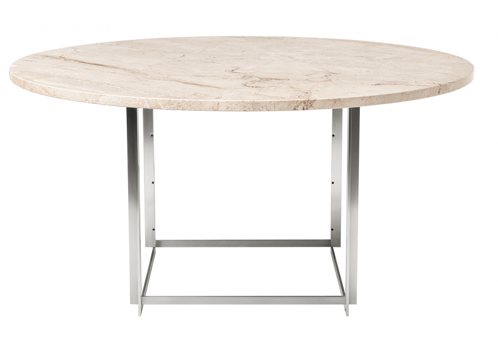 PK54 firmato da Poul Kjærholm per Fritz Hansen è un tavolo realizzato con piano in marmo o granito e base in acciaio inox satinato spazzolato. Disponibile in diverse finiture.