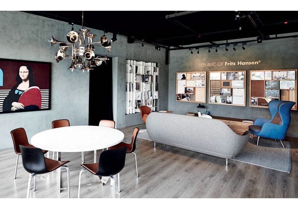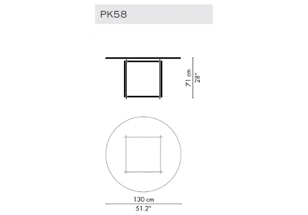 PK58 firmato da Poul Kjærholm per Fritz Hansen è un tavolo realizzato con piano in poliestere bianco e base in alluminio anodizzato satinato spazzolato.