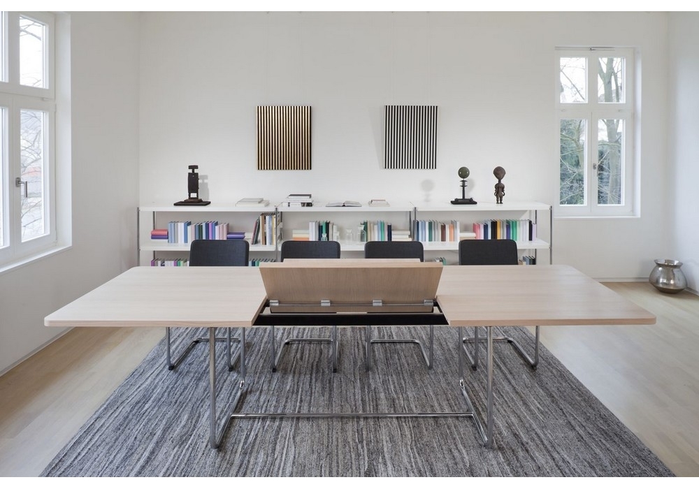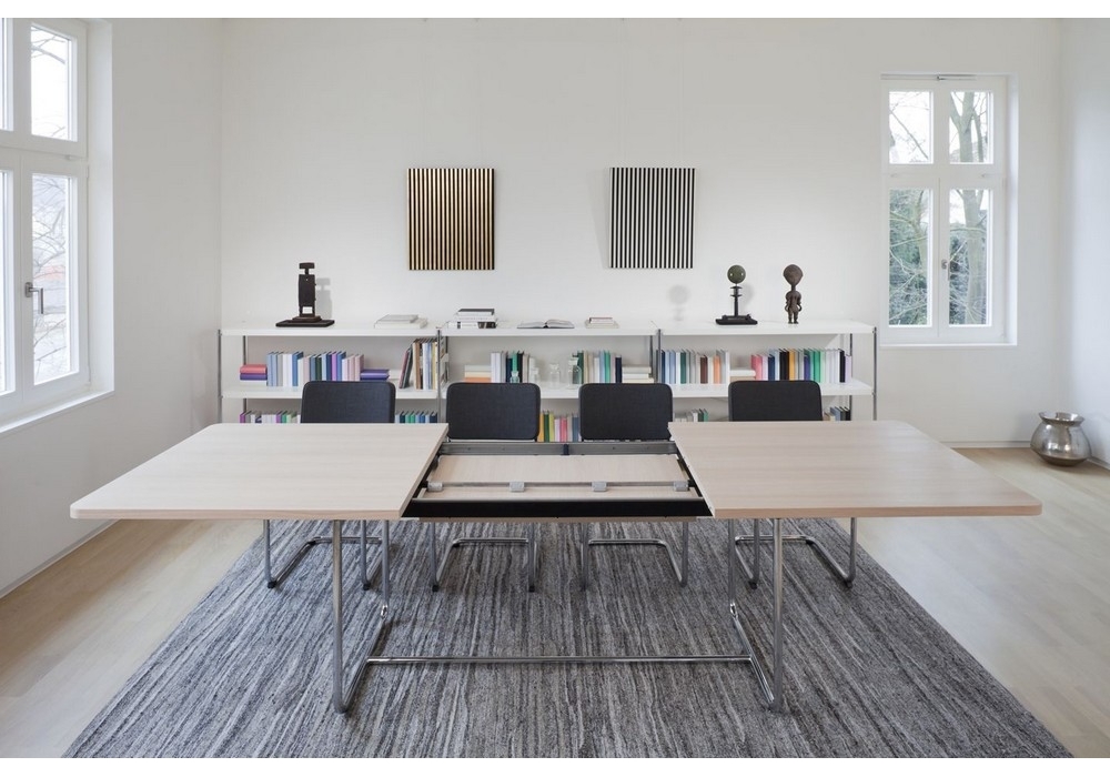 S 1072 firmato da Glen Oliver Löw per Thonet è un tavolo allungabile con prolunga 90 x 100 x 3 cm, struttura in tubolare d'acciaio cromata o laccata e piedini in plastica regolabili. Piano listellare con impiallacciatura in vero legno o ThonetDur®. Bordi rivestiti in massello in diverse finiture, angoli squadrati o arrotondati.