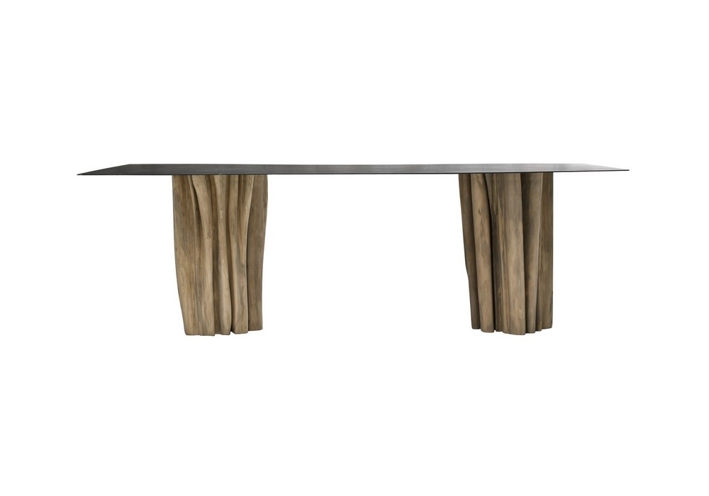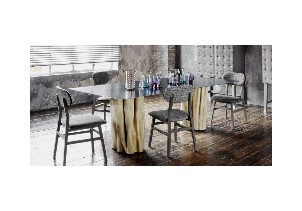 Brick firmato da Paola Navone per Gervasoni è un tavolo rettangolare con base realizzata con sezioni di tronco di carpino naturale, scortecciato, piano rettangolare in lamiera di ferro cerata.