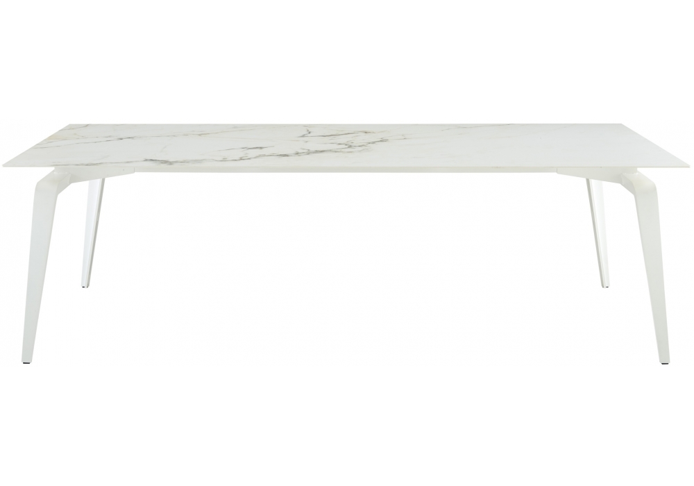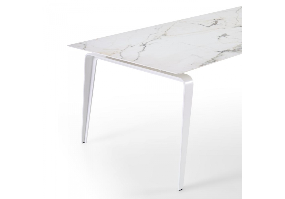 Odessa firmato da Mauro Lipparini per Ligne Roset è un tavolo da pranzo con base in acciaio piegato. Piano spesso 6 mm in gres porcellanato, la cui finezza visiva contrasta con la robustezza della base, è incollato ad una struttura in acciaio di sezione generosa comprensiva di piastra per i piedi. La struttura, solo parzialmente a vista, rientra di 12 cm rispetto al piano. Due eleganti profilati in alluminio laccato abbinati alla base collegano i piedi correndo su tutta la lunghezza del piano.
