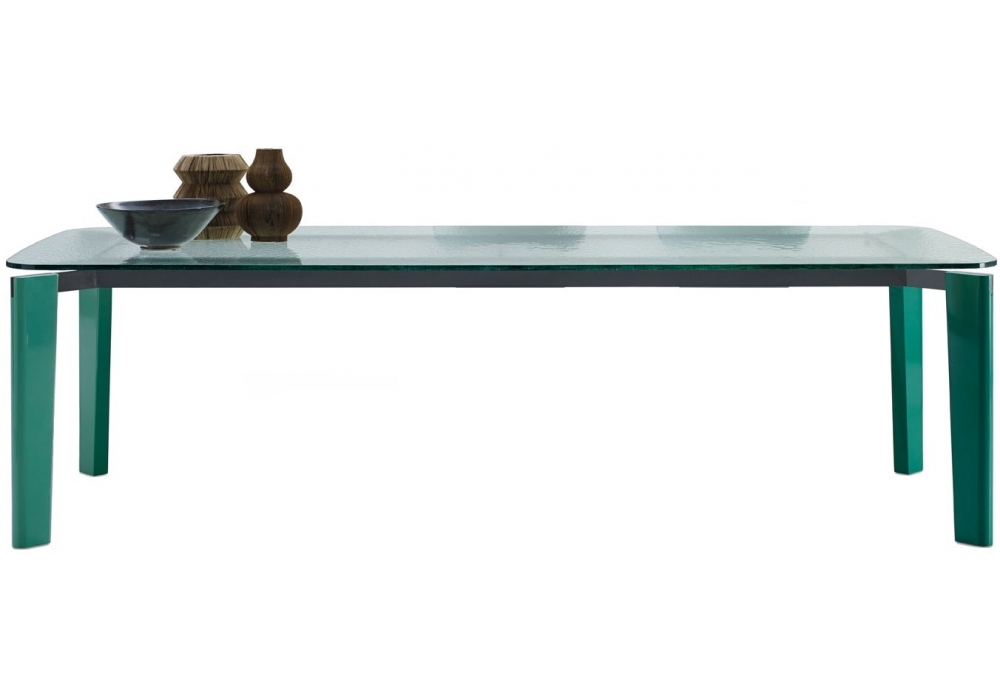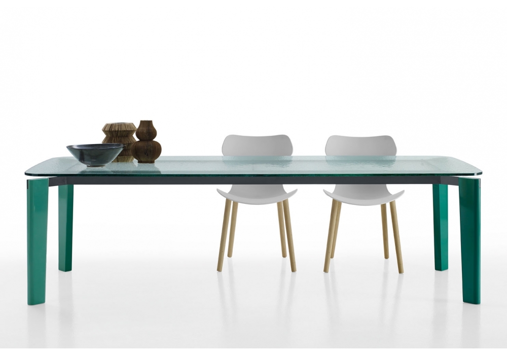 Oskar firmato da Vincent Van Duysen per B&B Italia è un tavolo iconico con piano in vetro cattedrale dalla superficie irregolare e dalla leggera tonalità verde che ben si sposa con le gambe colore laccato lucido o in rovere.