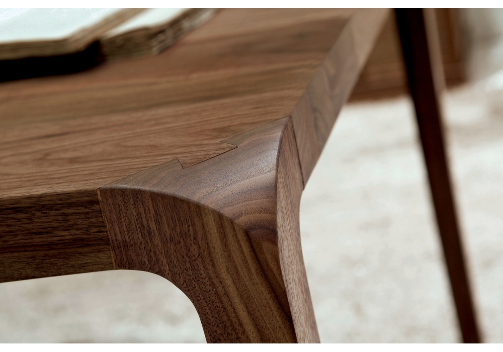 Sleek firmato da Karim Rashid per Riva 1920 è un tavolo interamente realizzato in legno massello con top a liste incollate sul quale, mediante un particolare sistema a coda di rondine, si incastrano le quattro gambe.