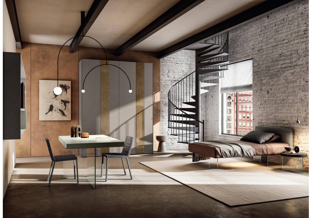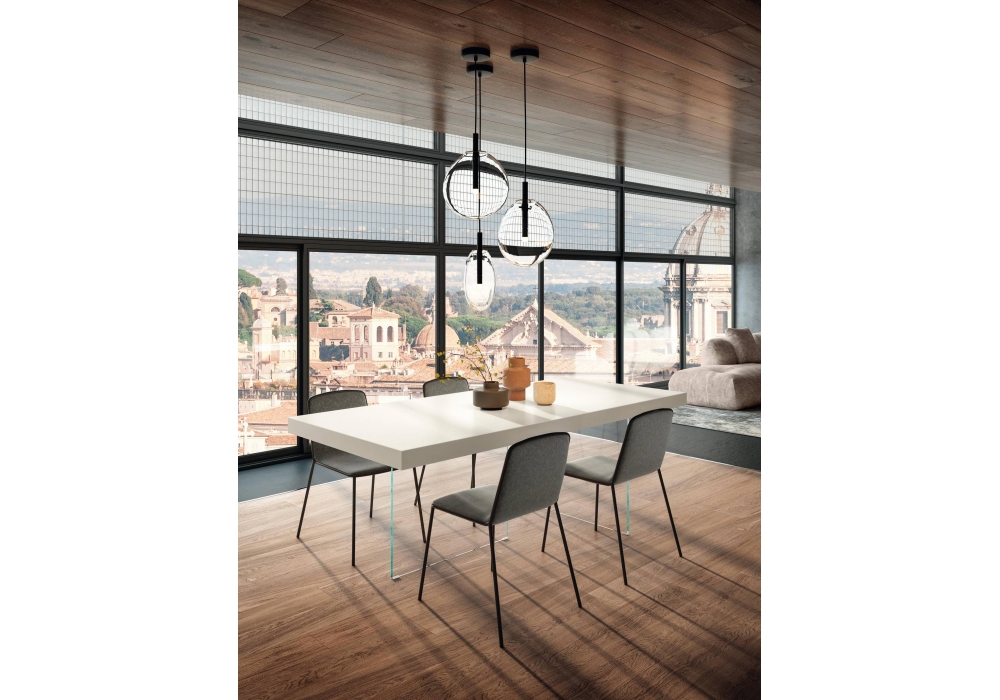 Air firmato da Daniele Lago per Lago è un tavolo realizzato con gambe in vetro extra-chiaro o fumé grigio e piano in laminato laccato. Disponibile in diverse finiture e dimensioni.