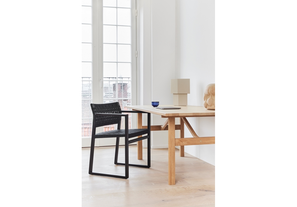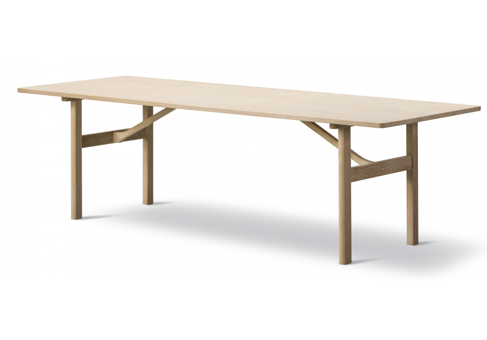 BM84 Mogensen firmato da Børge Mogensen per Fredericia è un tavolo rettangolare con piano e struttura in legno massello di rovere. Gamba montata con vite in ottone a vista.