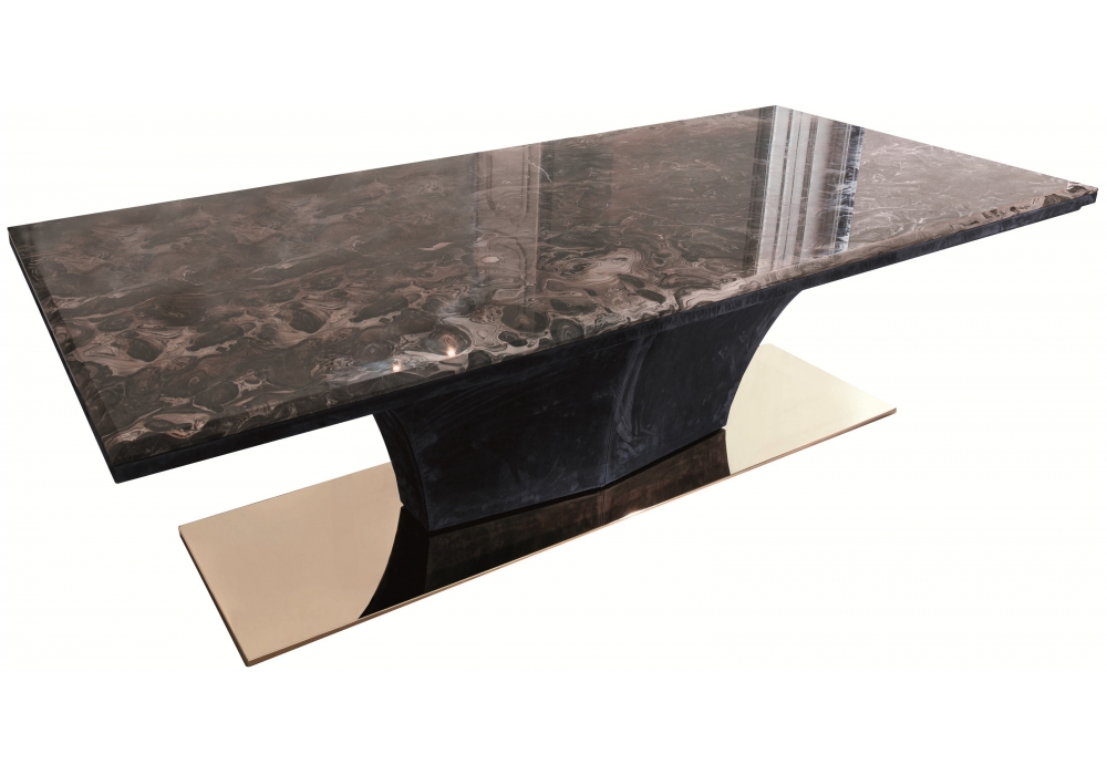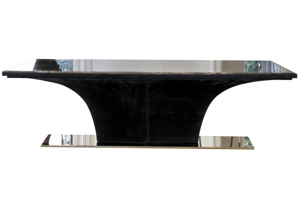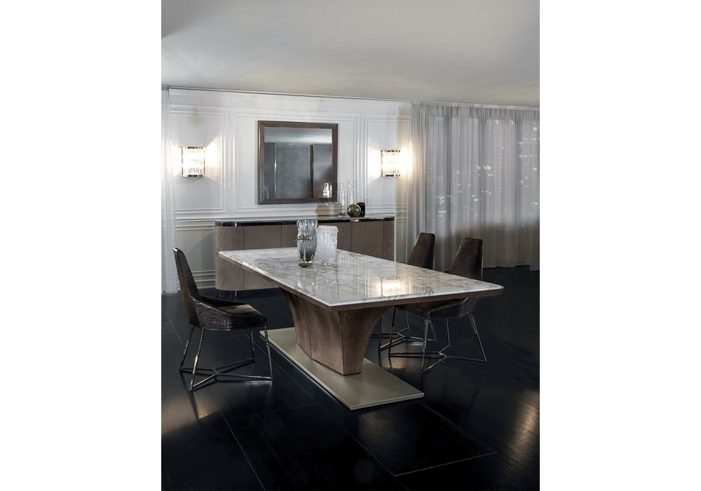 Omotesando firmato da Silvia Musetti per Longhi è un tavolo con base in metallo lucido o opaco, struttura esterna in legno rivestita in pelle e piano in marmo, cristallo o specchio. Disponibile in differenti dimensioni e finiture.