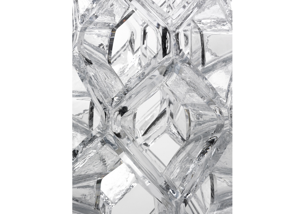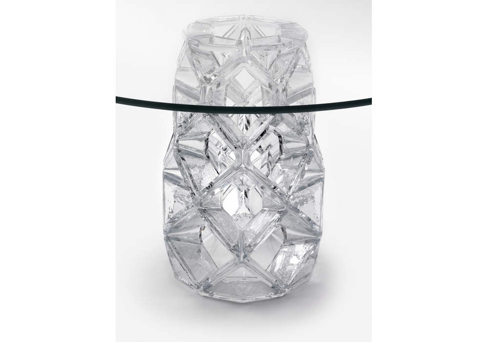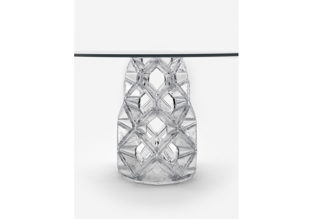 Homune disegnato da Michael Young per Lasvit è un tavolo. Realizzato in vetro soffiato a mano e cristallo. La gamba è concepita come una struttura frattale prodotta da 6 di forme diverse ripetute 6 volte. Ciascuno dei 36 elementi è stato soffiato prima mano e poi modellato in un unico pezzo.