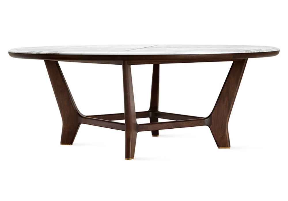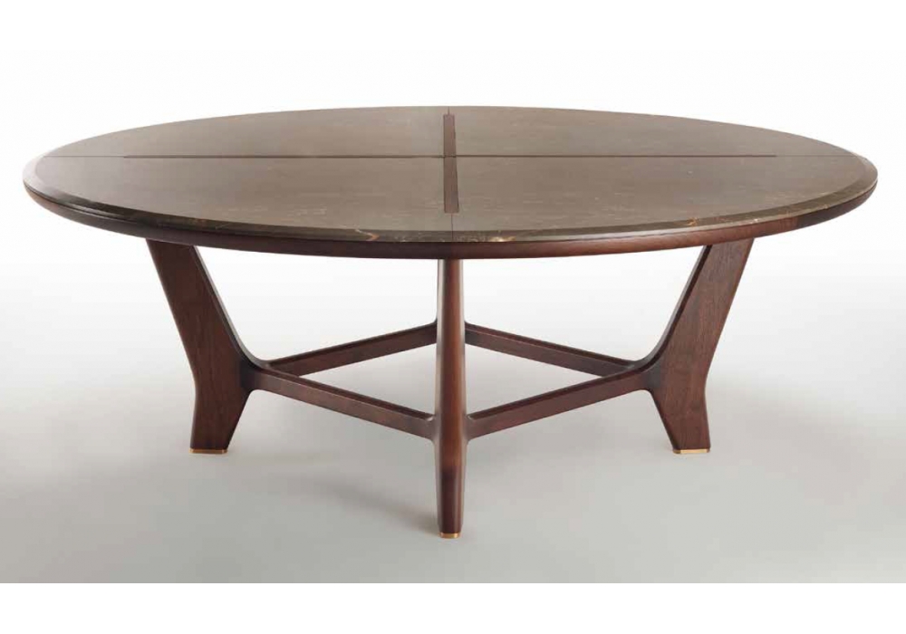 Grand Diner firmato da Giuseppe Casarosa per Ceccotti Collezioni è un tavolo rotondo con struttura realizzata in legno massello di noce americana. Piedini in ottone. Piano in marmo suddiviso in 4 sezioni con decorazione centrale in legno di noce americana Su richiesta, piano in legno.