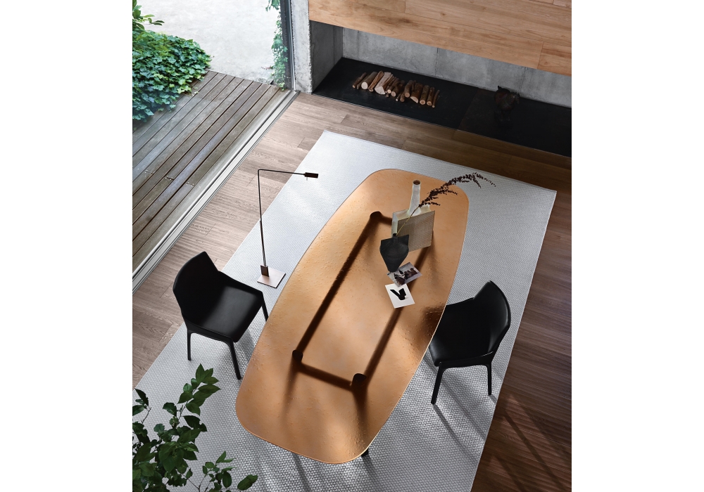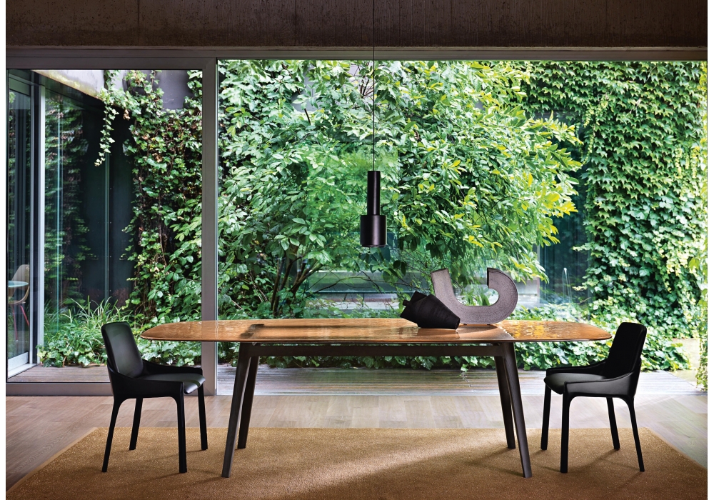Magma firmato da Patrick Jouin per Fiam è un tavolo con piano in vetro fuso e temperato da 15 mm retroverniciato con finiture semitrasparenti o con vernici metallizzate. Struttura in legno massello disponibile nella finitura Tabacco o nero termotrattato.