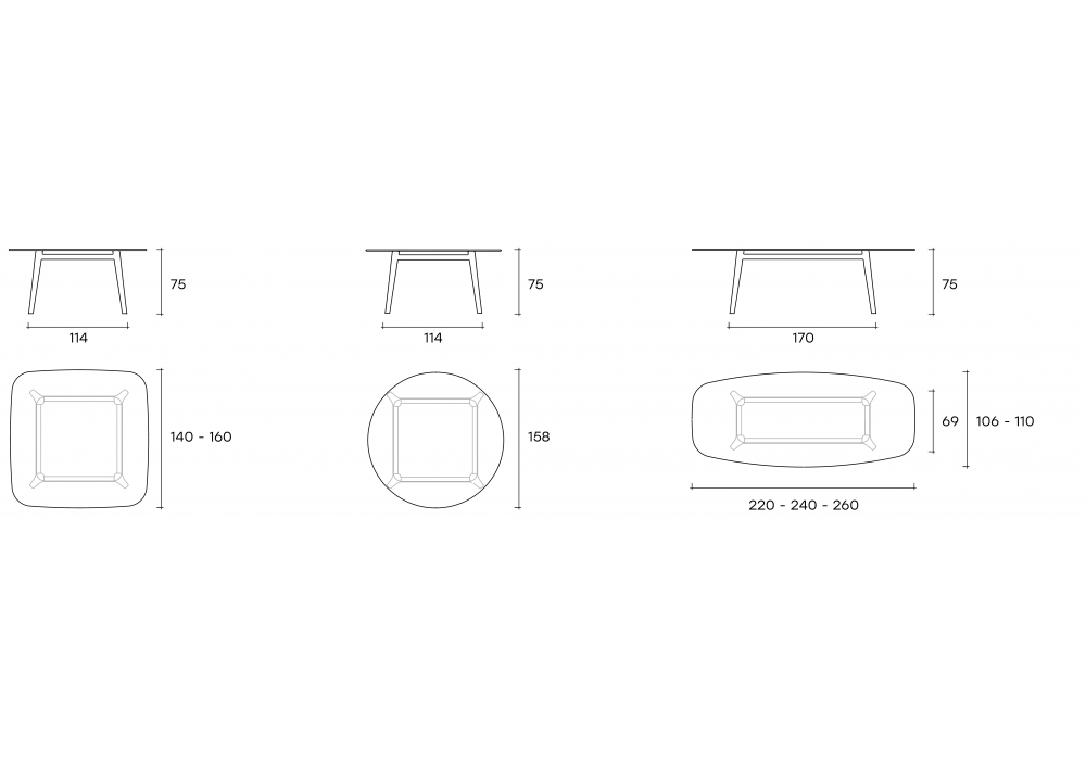 | Dimensioni | 220 x 106 x H 75 cm; 240 x 106 x H 75 cm; 260 x 110 x H 75 cm; 140 x 140 x H 75 cm; 160 x 160 x H 75 cm; Ø 158 x H 75 cm. |
