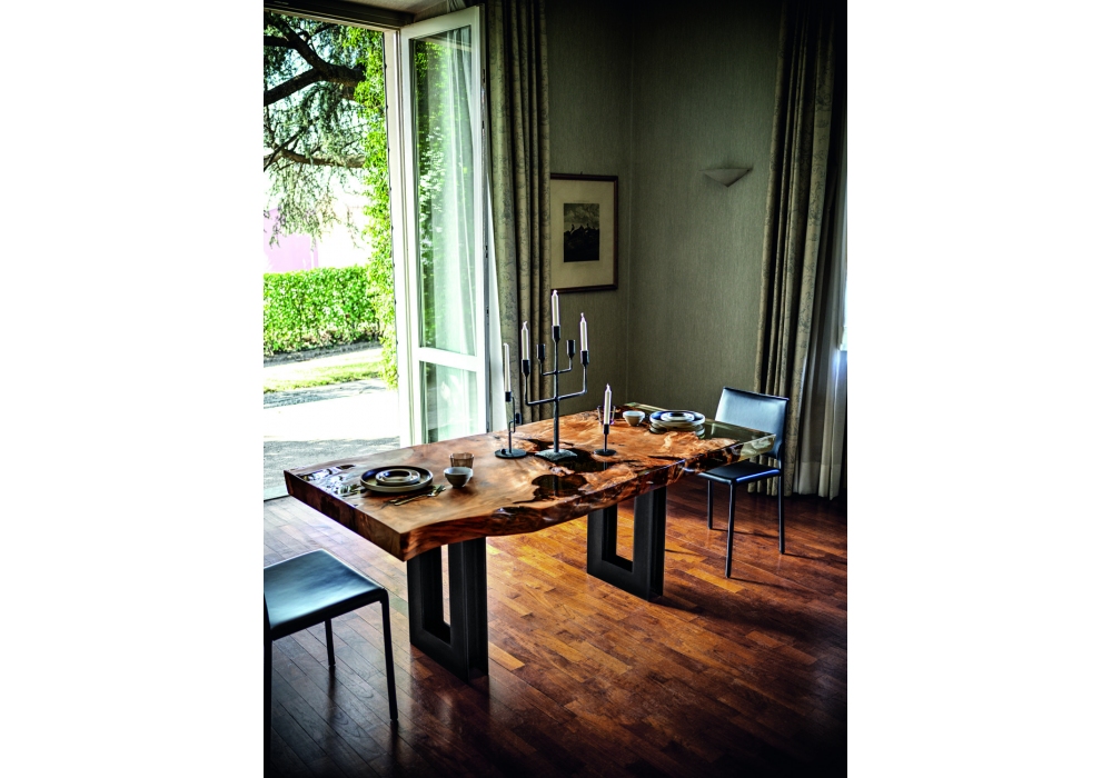Kauri Beam firmato da C.R.&S. Riva 1920 è un tavolo realizzato con top in massello di Kauri e base geometrica in ferro, che si ispira alla putrella (travetto di profilato metallico sagomato a doppio T).