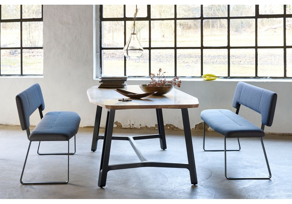S 1092 firmato da Randolf Schott per Thonet è un bellissimo tavolo con struttura in acciaio piatto curvato, nero "effetto ghisa". Traversa del tavolo in massello. Il piano in legno del tavolo è disponibile, a scelta, impiallacciato in faggio, frassino, rovere o noce.