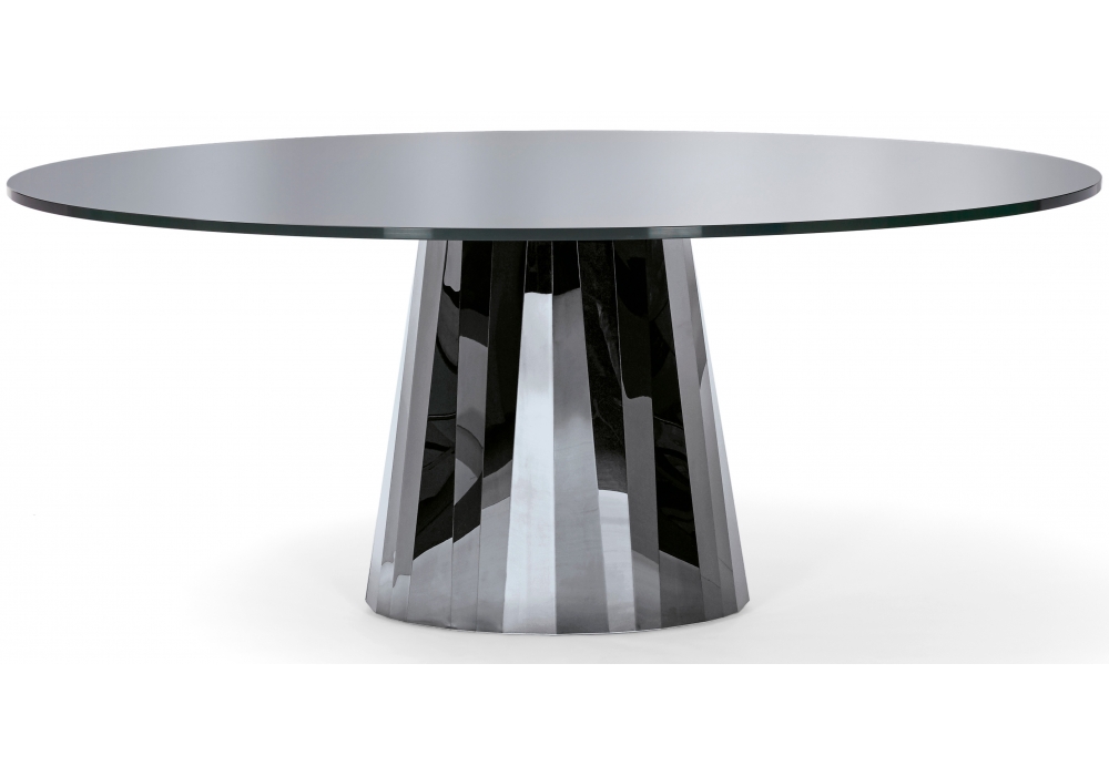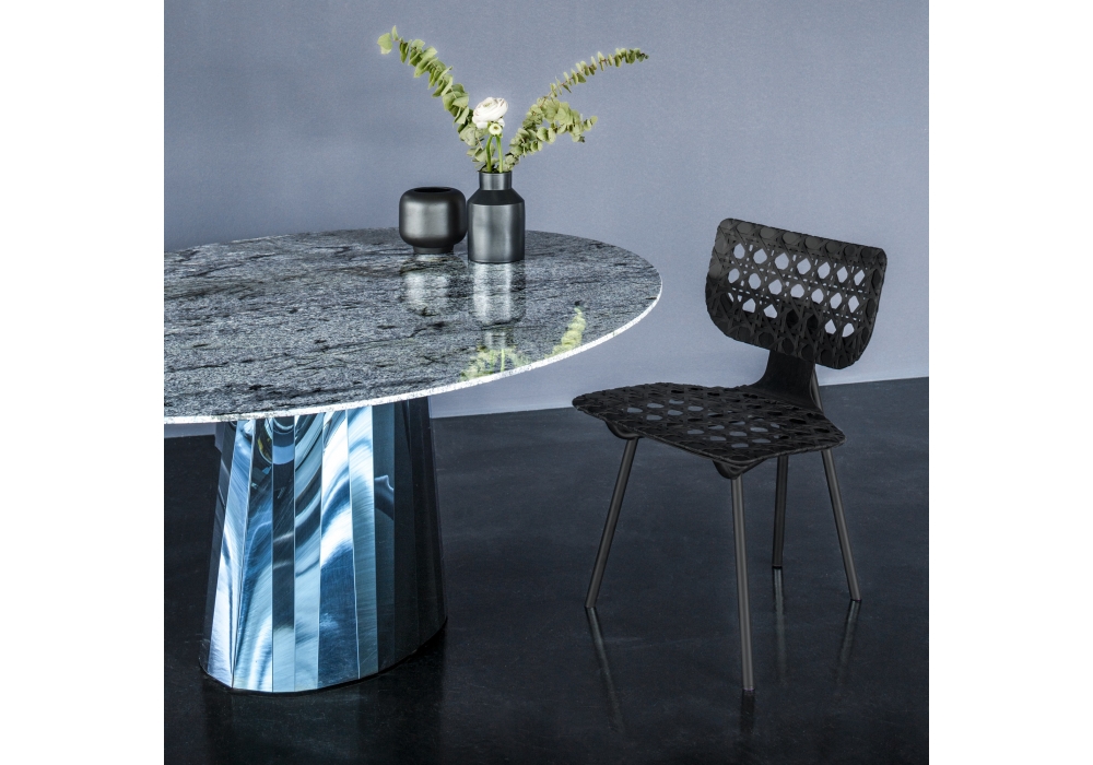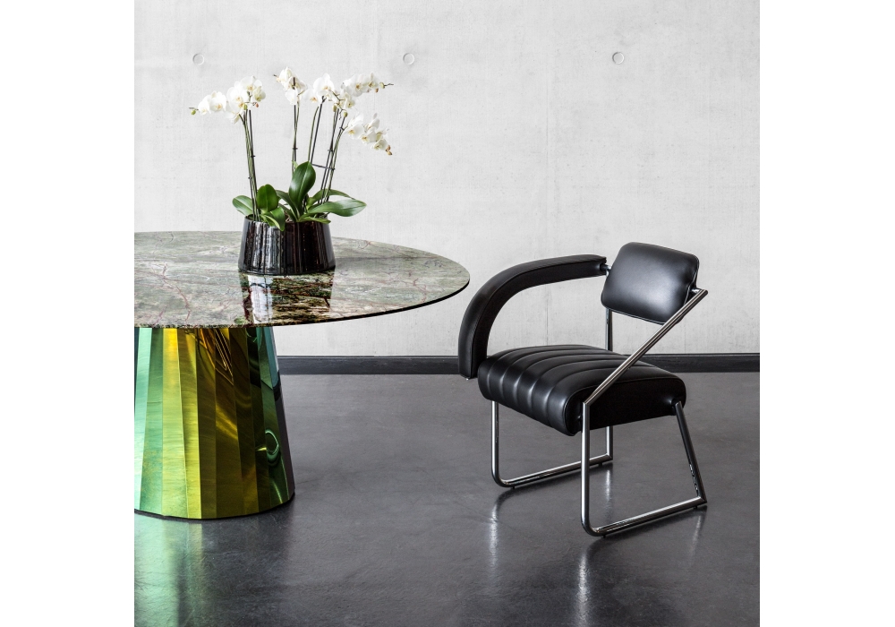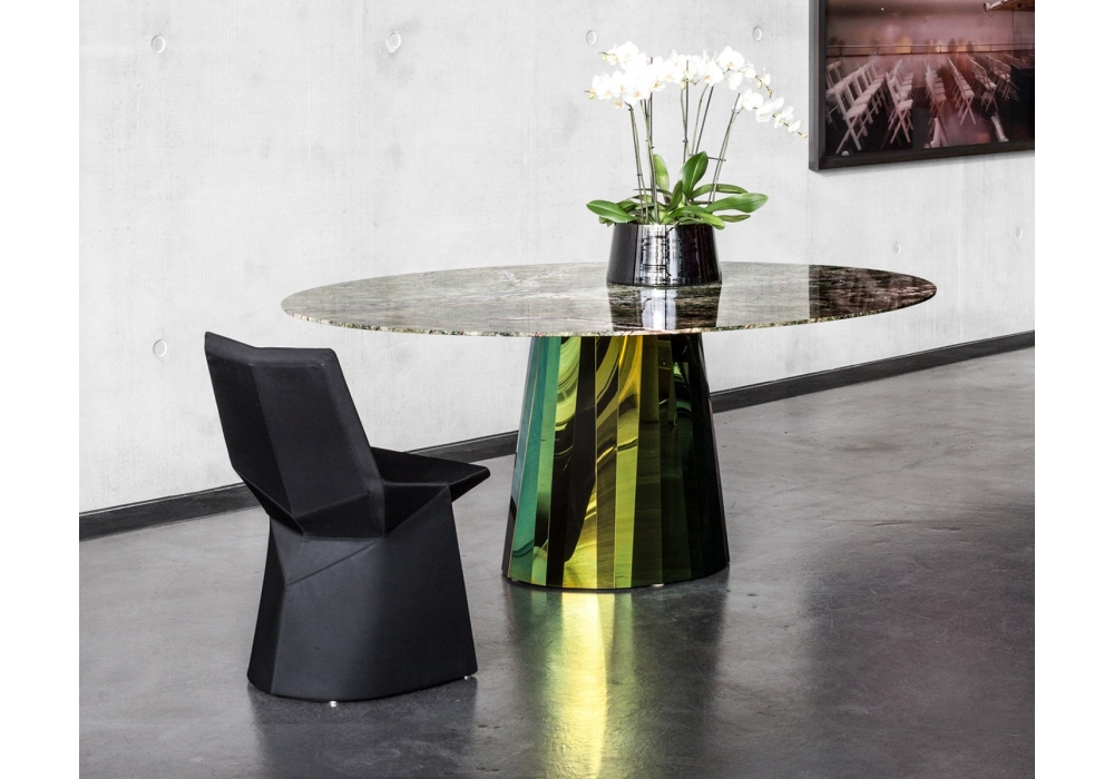 Pli firmato da Victoria Wilmotte per ClassiCon è un tavolo con base in lamiera di acciaio inossidabile lucidata piegata, in diversi colori. Le quattro diverse versioni dei colori risultano da una diversa durata del trattamento superficiale che fornisce all'acciaio inossidabile colori lucidi verde, blu, bronzo o nero.