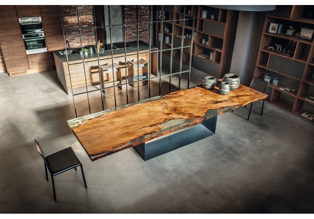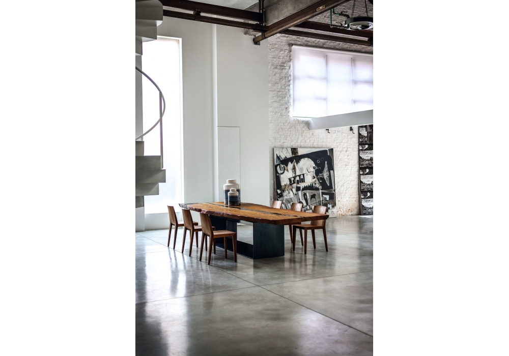 Cube Kauri firmato da C.R.&S. Riva 1920 è un tavolo realizzato con top in massello di Kauri, abbinato ad una base in ferro con sezione a slitta.