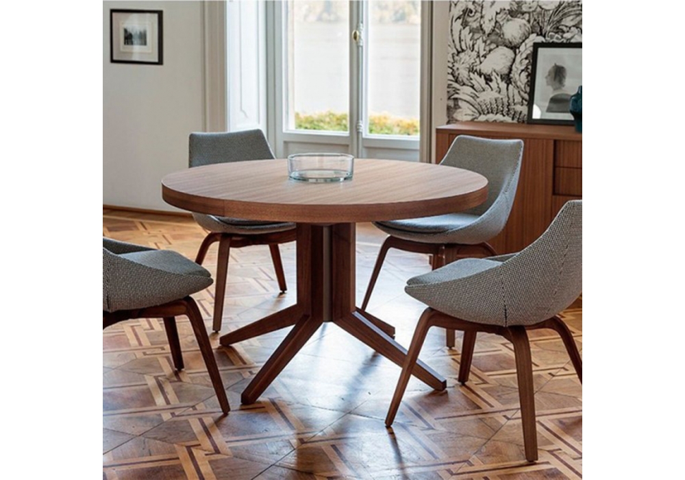 Bryant firmato da Opera Design per Porada è un tavolo da pranzo allungabile in massello di noce canaletta o laccato opaco poro chiuso in diverse finiture. L’allunga centrale é ripiegata su se stessa sotto il piano.