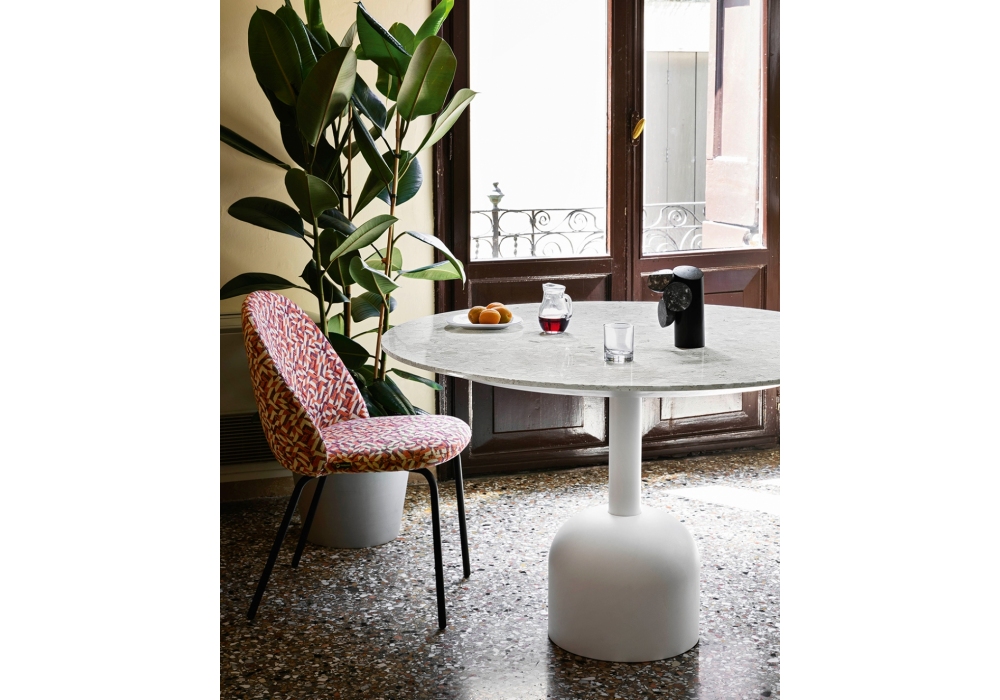 Illo firmato da Miniforms Labs per Miniforms è un tavolo con base laccata, colonna centrale nella finitura rame, oro rosa opaco, zincato o nella stessa finitura della base, top in ceramica o marmo. Disponibile in diverse finiture e dimensioni.