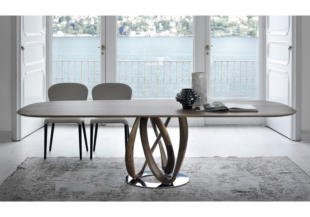 Infinity L firmato da S. Bigi per Porada è un tavolo da pranzo in massello di noce canaletta o frassino disponibile in diverse finiture. Disponibile in diverse dimensioni, con una o due basi montate su una piastra di metallo.