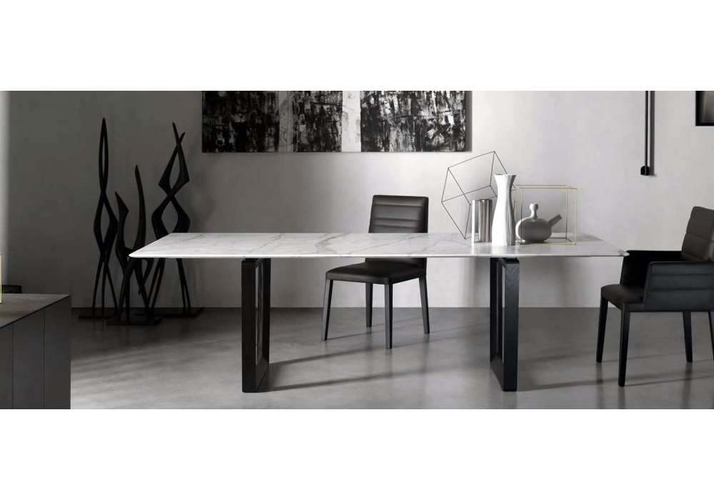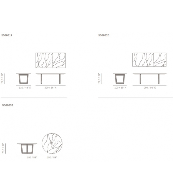 I tavoli da 220x110 cm, 250x100 cm e la versione rotonda con diametro 150 sono disponibili anche con il piano in Marmo Calacatta Oro realizzato con bordo smussato a finitura semilucida o lucida poliestere. Nella finitura semilucida il piano in marmo è trattato superficialmente con una soluzione idrorepellente protettiva che gli dona un aspetto più naturale. Nella finitura lucida viene invece applicata una vernice poliestere trasparente che conferisce al piano maggiore resistenza superficiale evitando l’assorbimento dei liquidi. Nelle versioni in marmo le gambe del tavolo sono in frassino tinto wengè o in noce Canaletto.