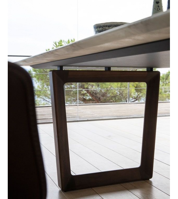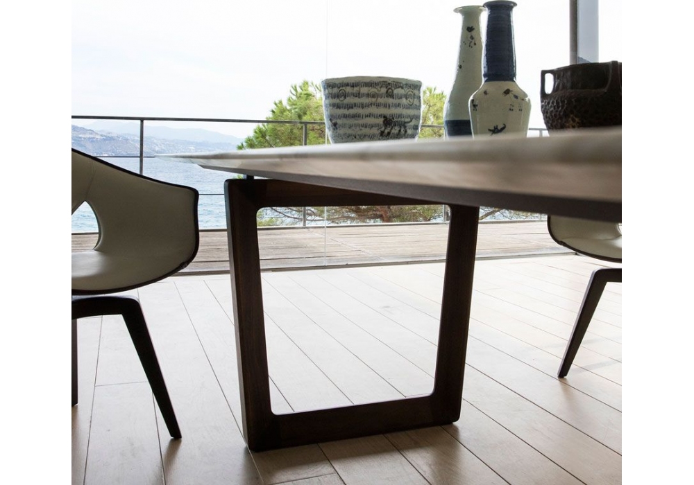Poltrona Frau Bolero tavolo: Una presenza essenziale e slanciata nel living. Il piano, unito ai sostegni tramite un distanziatore, sembra quasi galleggiare nello spazio. La sua geometria lievemente a trapezio accentua la percezione visiva di uno spessore ridotto al minimo.