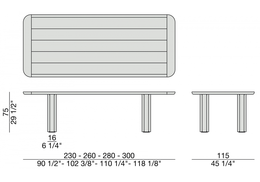 | Dimensioni | L 230 x W 115 x H 75 cm; L 260 x W 115 x H 75 cm; L 280 x W 115 x H 75 cm; L 300 x W 115 x H 75 cm |