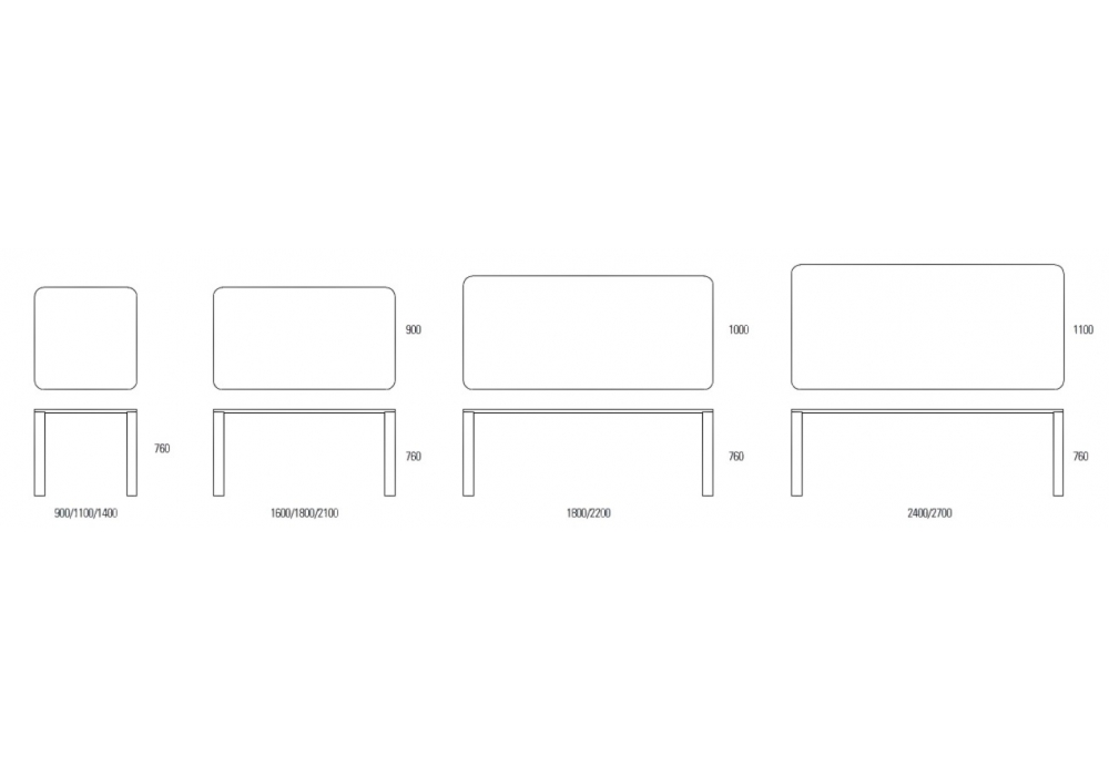 | Dimensioni | 90 x 90 x H 76 cm; 110 x 110 x H 76 cm; 140 x 140 x H 76 cm; 160 x 90 x H 76 cm; 180 x 90 x H 76 cm; 210 x 90 x H 76 cm; 180 x 100 x H 76 cm; 220 x 100 x H 76 cm; 240 x 110 x H 76 cm; 270 x 110 x H 76 cm |