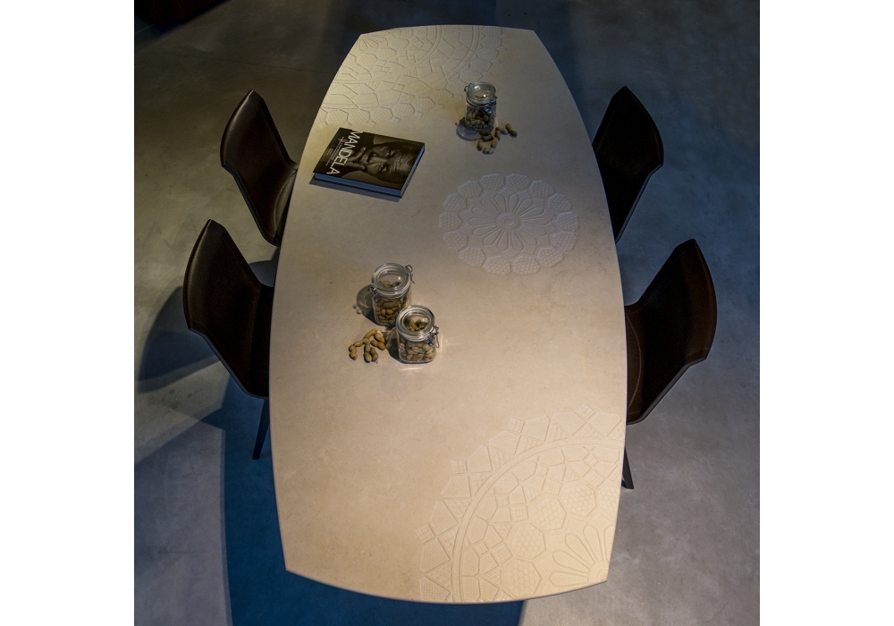 Tavoliranni firmato da Marella Ferrera per Lithea è un tavolo da pranzo con piano in marmo o pietra e base in legno. Disponibile anche in 3 dimensioni.