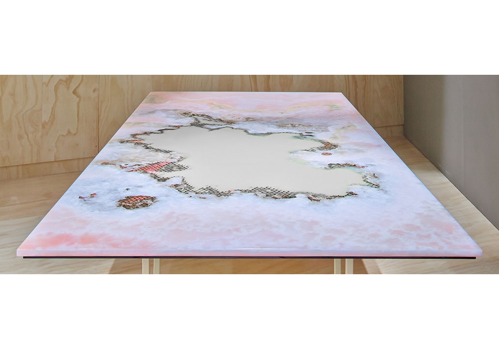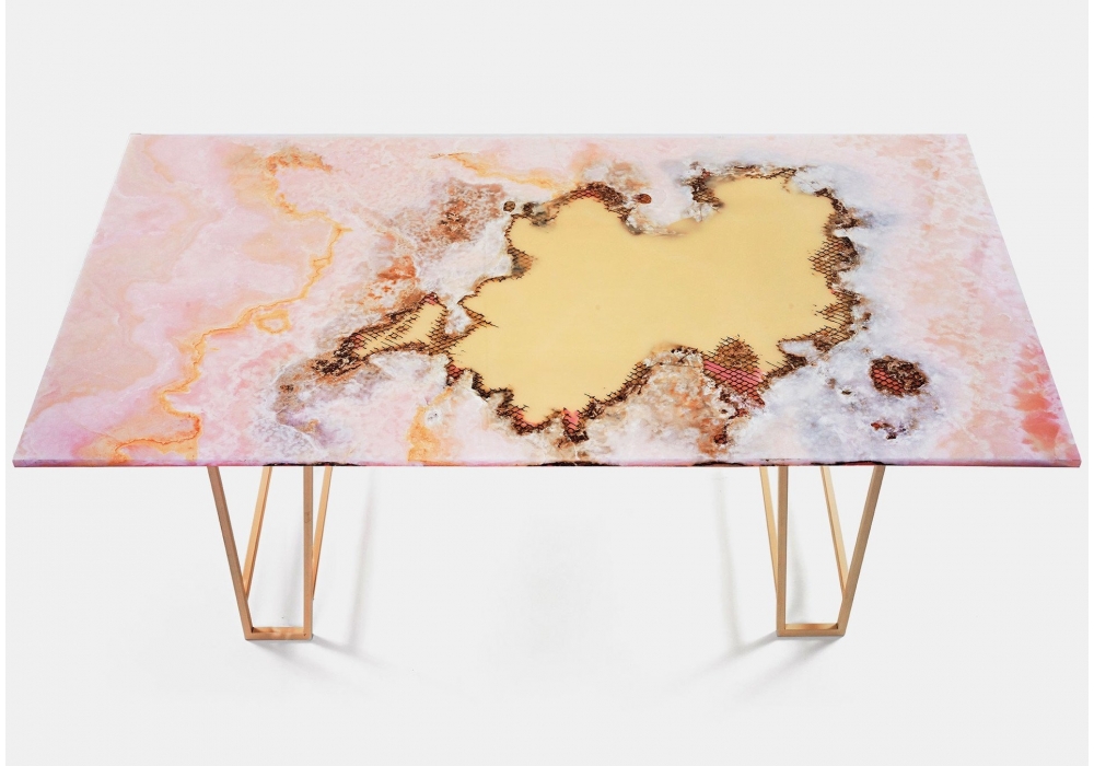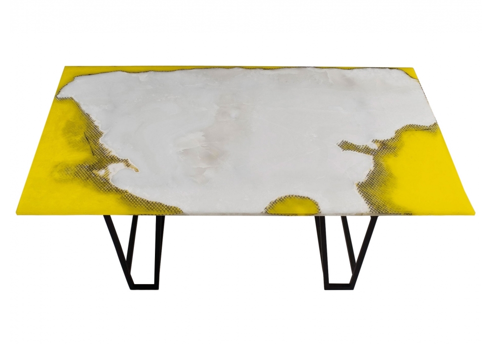 Canyon firmato da Patricia Urquiola per Budri è un tavolo realizzato in onice e resina con gambe in metallo. Disponibile anche in 2 finiture: bianco e giallo fluo o rosa e color crema.