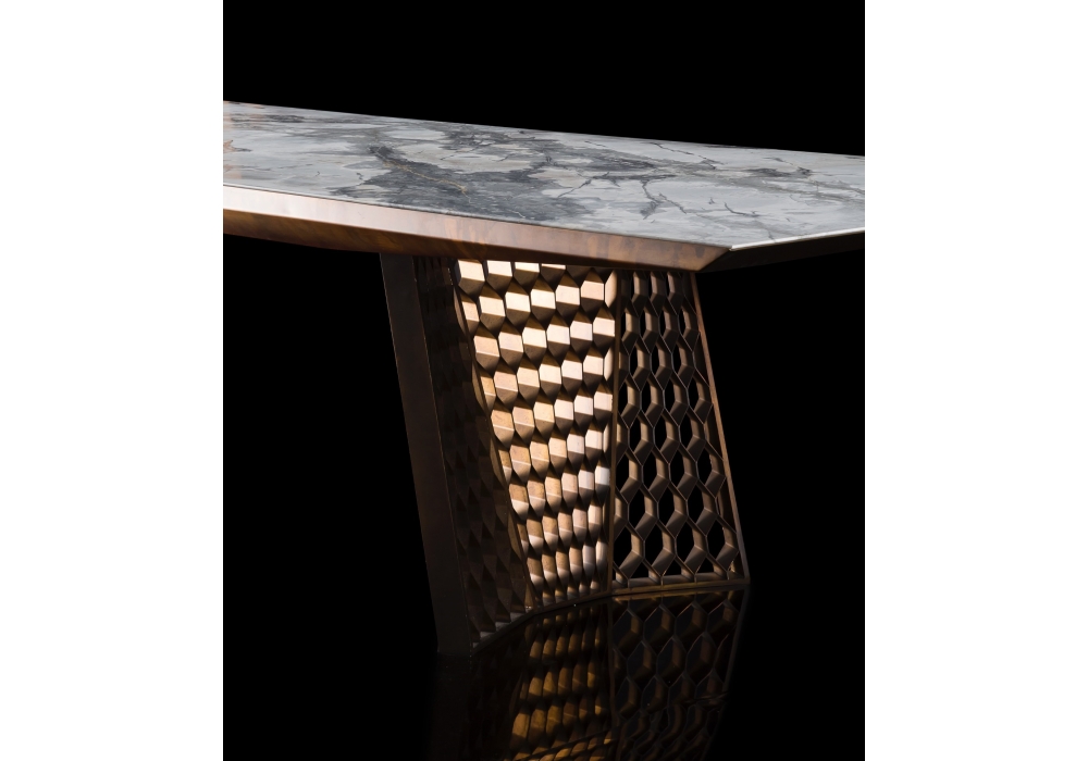 Stealth firmato da Massimo Castagna per Henge è un tavolo quadrangolare realizzato con piano in pietra o legno. La struttura e le gambe sono in acciaio brunito a mano nella finitura ottone con traforatura a nido d'ape. Stealth è disponibile in differenti finiture e dimensioni.