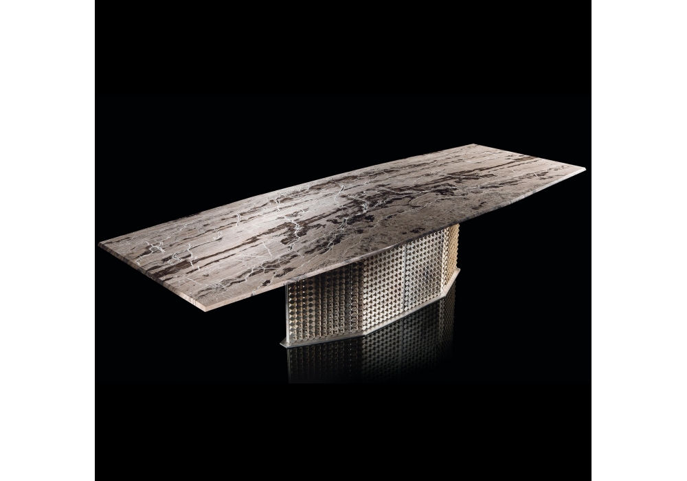 S-Penny firmato da Massimo Castagna per Henge è un tavolo quadrangolare realizzato con piano in pietra o legno termotrattato e struttura in acciaio nero. La base è rifinita con un motivo ""penny"" in metallo con finitura Ottone Brunito o H-Silver (puro argento al 99,9% su ottone). S-Penny è disponiibile in diverse finiture e dimensioni.