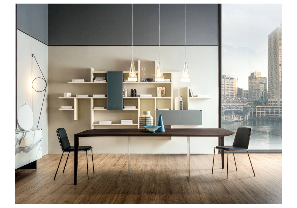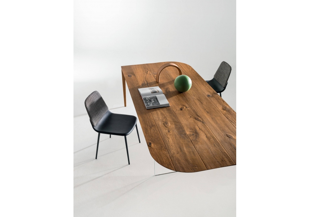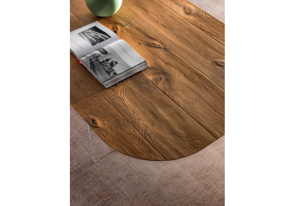 P&J firmato da Daniele Lago per Lago è un tavolo con piano in Wildwood. Gambe in vetro extra-chiaro e acciaio impiallacciato Wildwood.