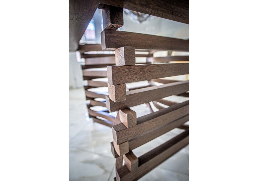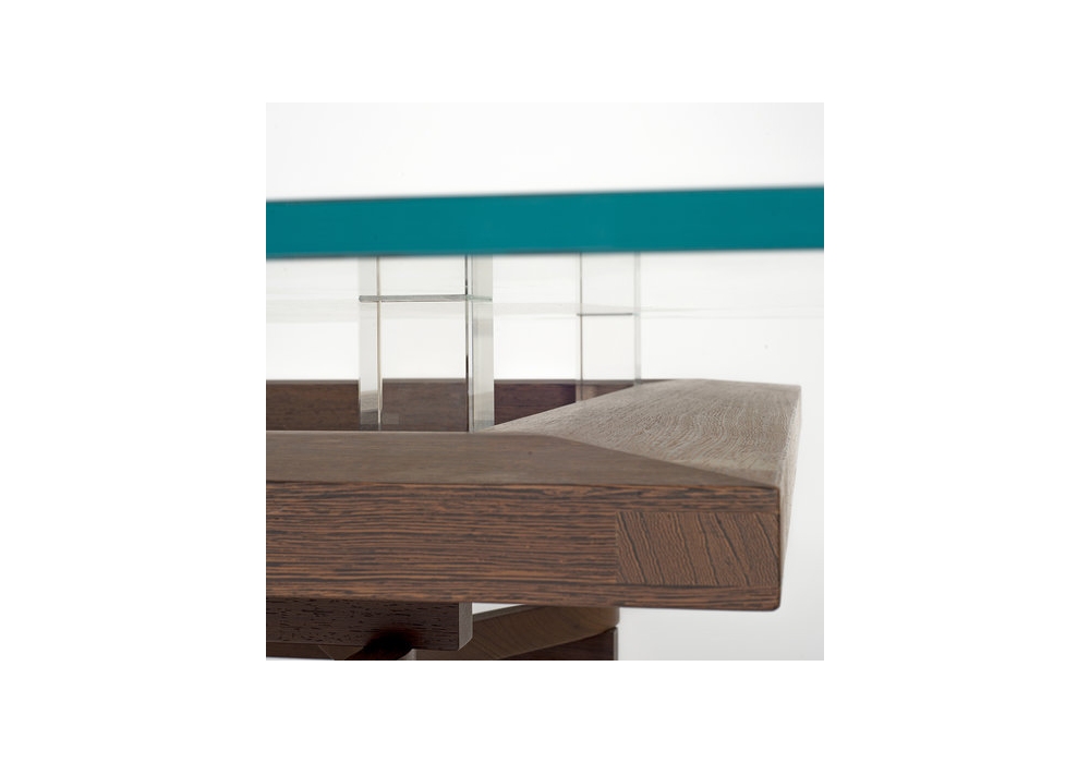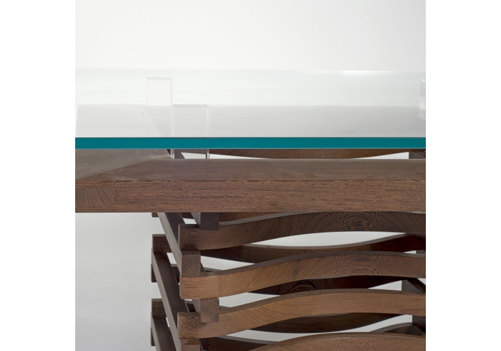 Ring firmato da Salvatore Longo per Ornythos è un tavolo da pranzo con un piedistallo quadrato in wenge, che sostiene un top in vetro temperato.