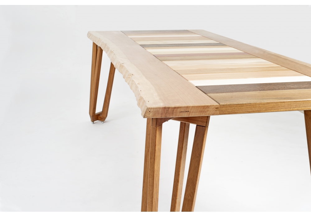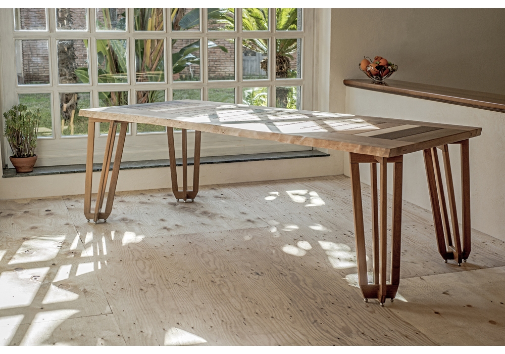 Forma Undici firmato da Salvatore Longo per Ornythos è un tavolo da pranzo in legno, con il top a doghe di diverse specie legnose: wenge, doussier, amazaque, pino, castagno, acero, purple, iroko, ciliegio.