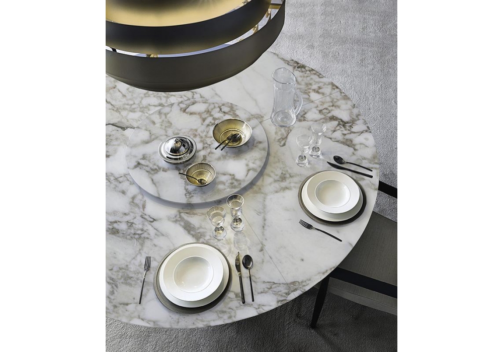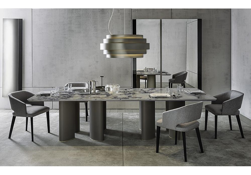 Arne firmato da Roberto Lazzeroni per Casamilano è un tavolo con piano realizzato in marmo e sottopiano in MDF laccato. Le gambe, ovali, sono rivestite in pelle, laccate o in frassino fiammato.