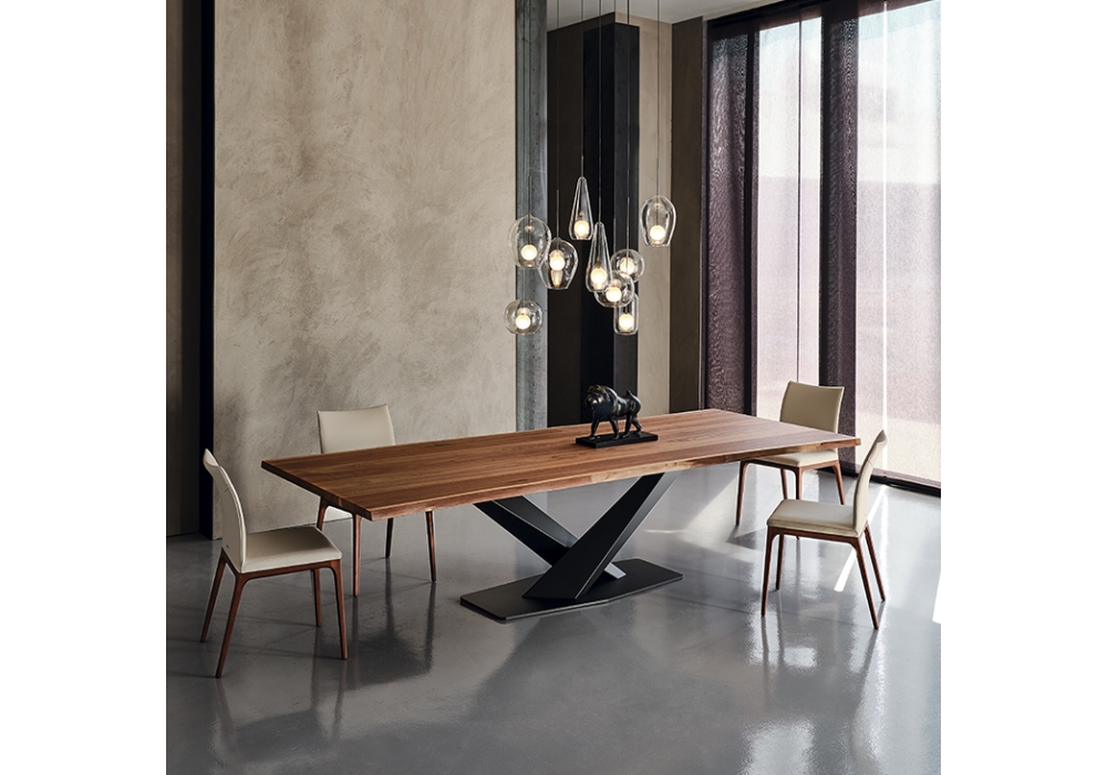 Stratos Wood firmanto da Studio Kronos per Cattelan Italia è un tavolo realizzato con con base in acciaio verniciato goffrato. Versione "S" con bordi irregolari in massello di noce Canaletto, rovere bruciato o rovere naturale (spessore 4cm). Versione "A": piano con bordi obliqui in noce Canaletto, rovere bruciato o rovere naturale, il piano 200x100 ha lo spessore di 4cm, il 240x120 e il 300x120 di 5cm. Versione "B": piano a botte con bordi bisellati in noce Canaletto o rovere bruciato. Versione "Masterwood": Piano sagomato in noce Canaletto o rovere bruciato realizzato con listelli, diversi tra loro, posizionati in diagonale.