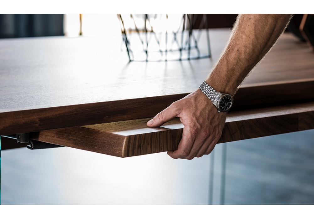 Ikon Drive firmato da Philip Jackson per Cattelan Italia è un tavolo allungabile con base in cristallo temperato trasparente 15 mm, trave in metallo o legno e piano in legno con bordi irregolari in legno massello. Disponibile in due dimensioni.