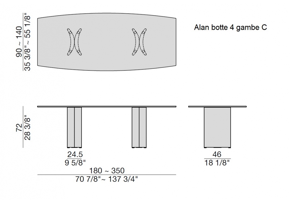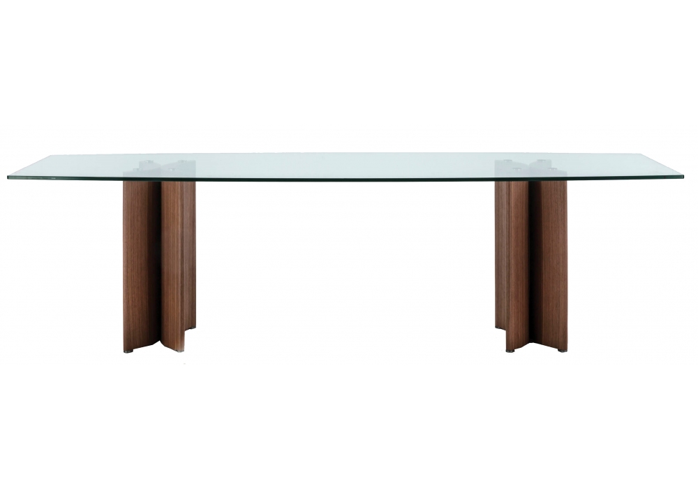 Alan gambe C firmato da Gabriele e Oscar Buratti per Porada è un tavolo con base costituita da elementi a mezzaluna in noce canaletta e piano in cristallo trasparente. Puntali in metallo cromo nero. Disponibile in diverse dimensioni nelle versioni rotondo, a botte e rettangolare.