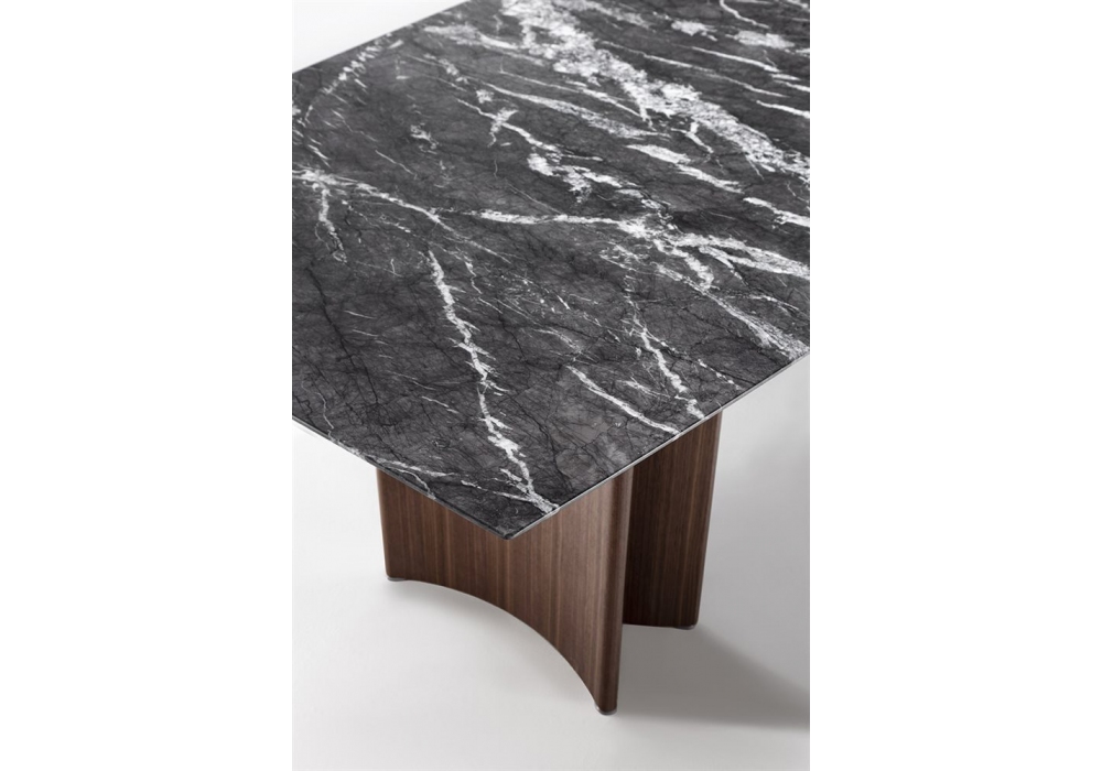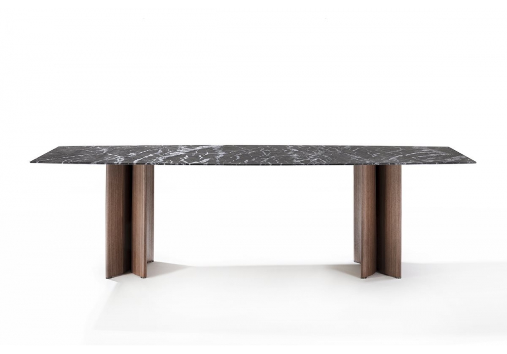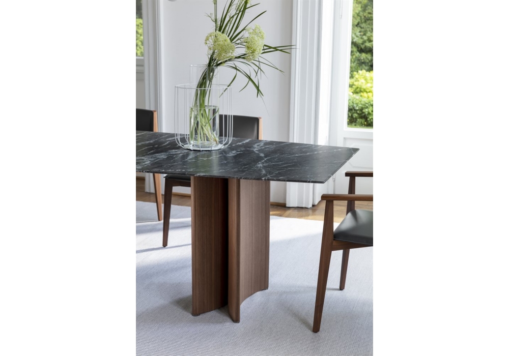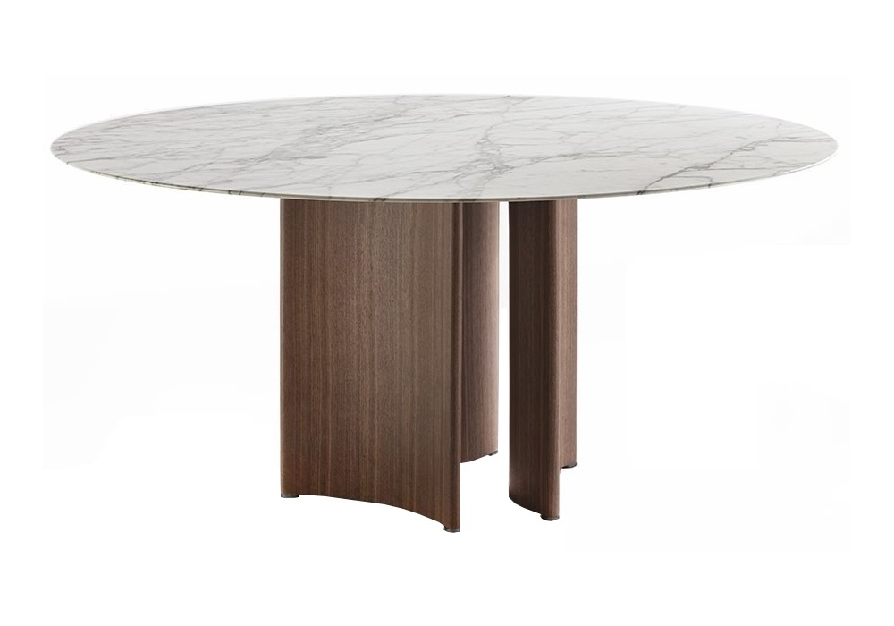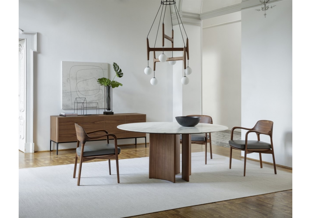 Alan gambe M firmato da Gabriele e Oscar Buratti per Porada è un tavolo con base costituita da elementi a mezzaluna singoli o accoppiati in noce canaletta e piano in marmo. Puntali in metallo finitura cromo nero. Disponibile in diverse dimensioni nelle versioni rotondo e rettangolare.