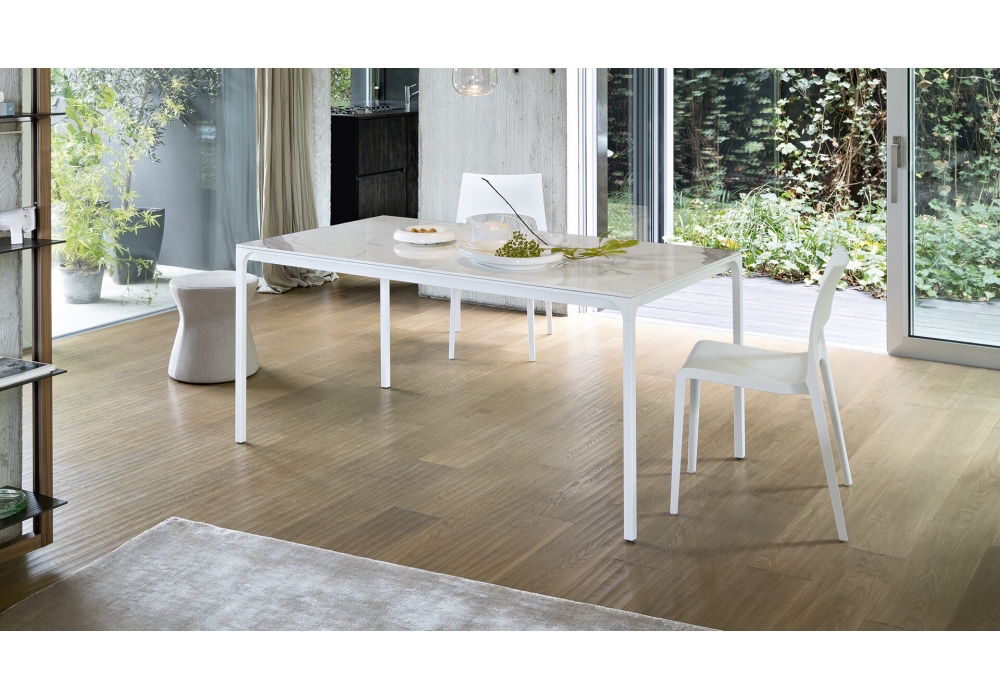 Zen firmato da Marconato & Zappa per Bonaldo è un tavolo allungabile con struttura in metallo verniciato opaco e piano in laccato opaco, cristallo, ceramica opaca o ceramica lucida. Disponibile in diverse dimensioni.