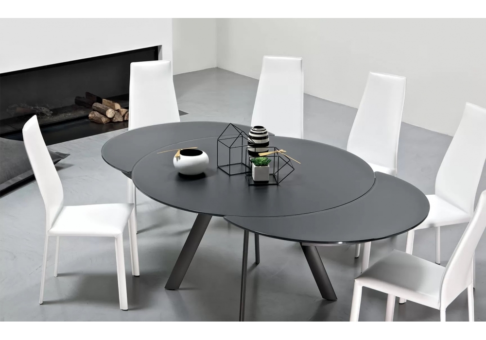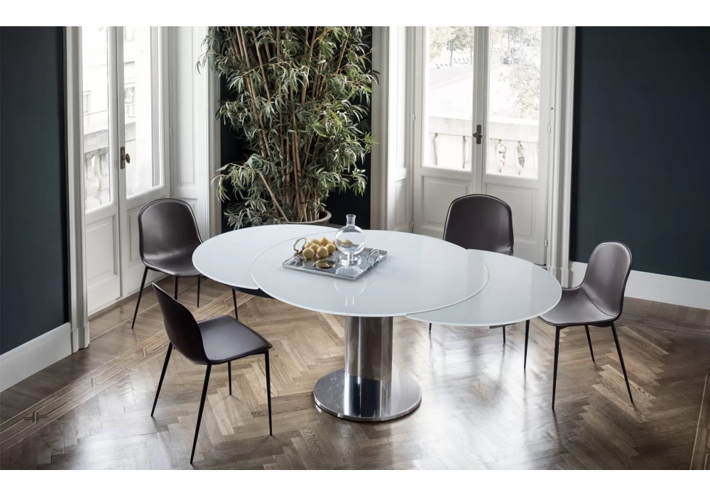 Giro firmato da Enio Calosi & Amedeo De Maria per Bontempi è un tavolo allungabile con struttura in metallo disponibile con gambe o base a colonna. Sono disponibili diverse finiture.