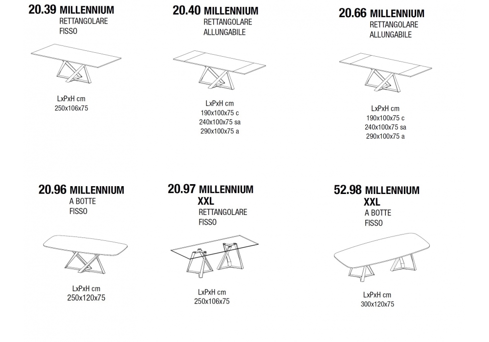 | Dimensioni | • 250 x 106 x H 75 cm; • 160-200-240 x 90 x H 75 cm; • 190-240-290 x 100 x H 75 cm; • 250 x 120 x H 75 cm; • 250 x 106 x H 75 cm; • 300 x 120 x H 75 cm |