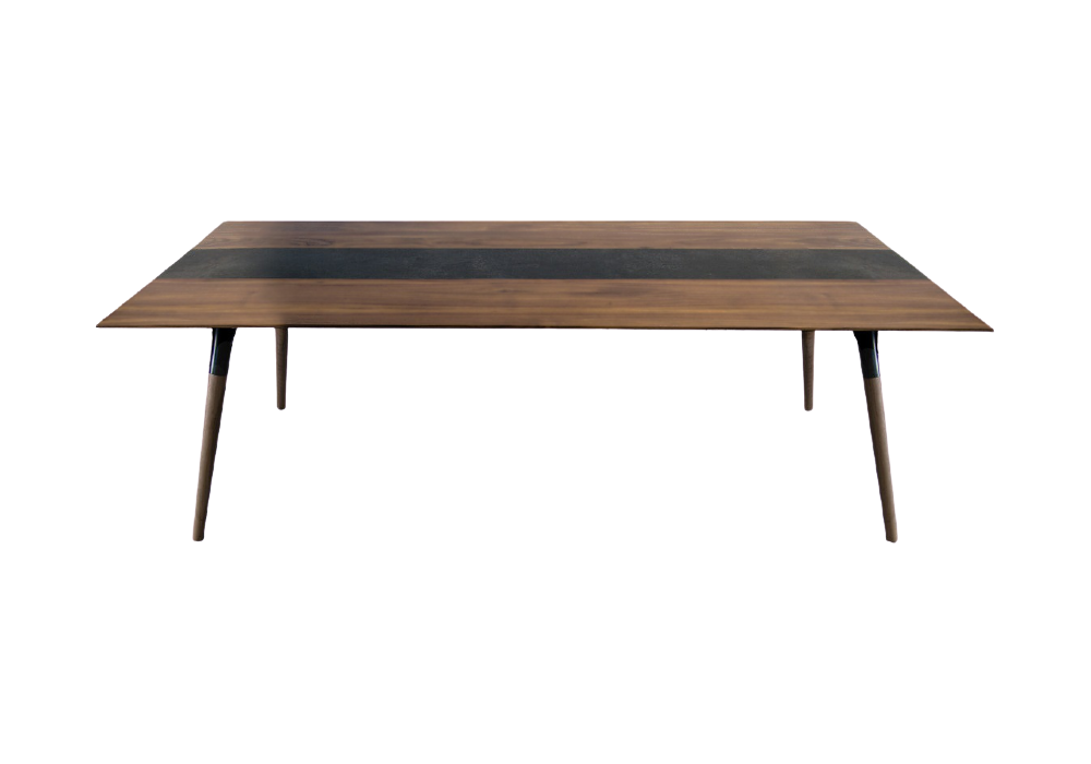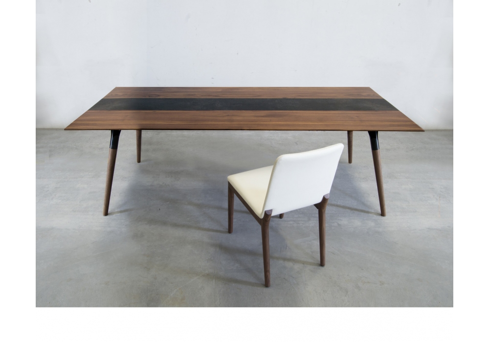 Salt&Pepper firmato da Guggenbichler per Tonon è un tavolo con gambe in legno massello di rovere o noce canaletto con dettaglio in acciaio inox lucido, opaco o laccato nero. Piano formato da due pannelli laterali in massello di rovere o noce canaletto, lastra centrale in ceramica in ossido nero di 10 mm.