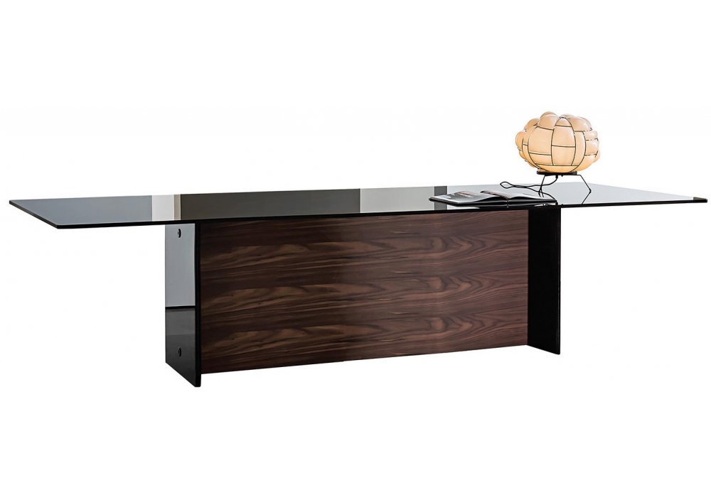 Regolo Double Base firmato da Lievore, Altherr, Molina per Sovet è un tavolo realizzato con top in vetro, base composta da un elemento in legno e due elementi in vetro stratificato laccato nero. Top ed elemento in legno in diverse finiture.