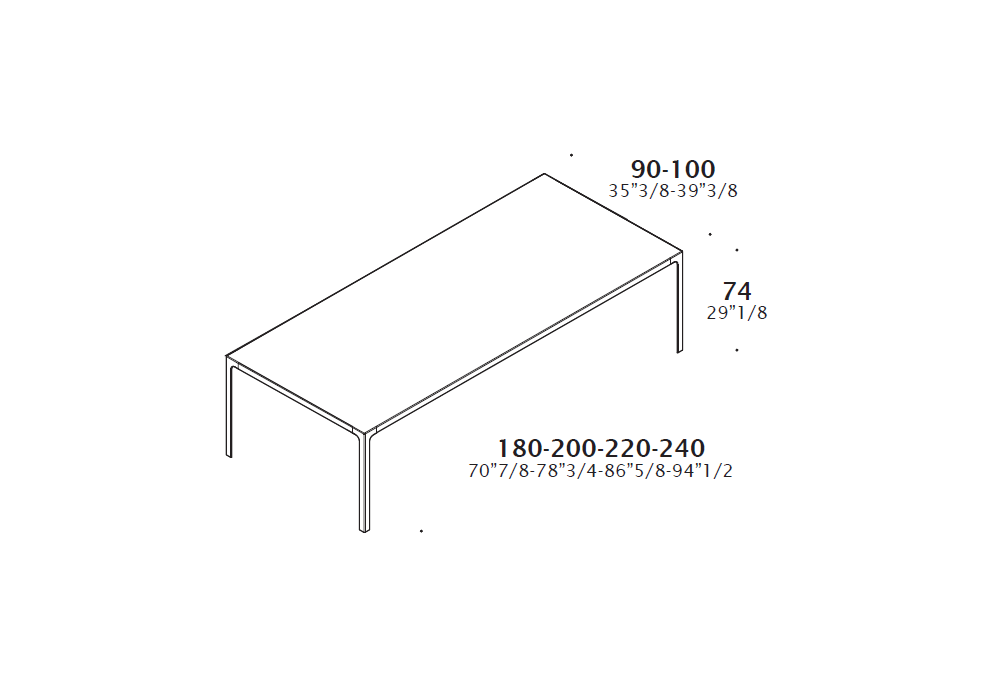 | Dimensioni | • 180 x 90 x H 74 cm; • 200 x 100 x H 74 cm; • 220 x 100 x H 220 cm; • 240 x 100 x H 74 cm; • 120 x 120 x H 74 cm; • 140 x 140 x H 74 cm |