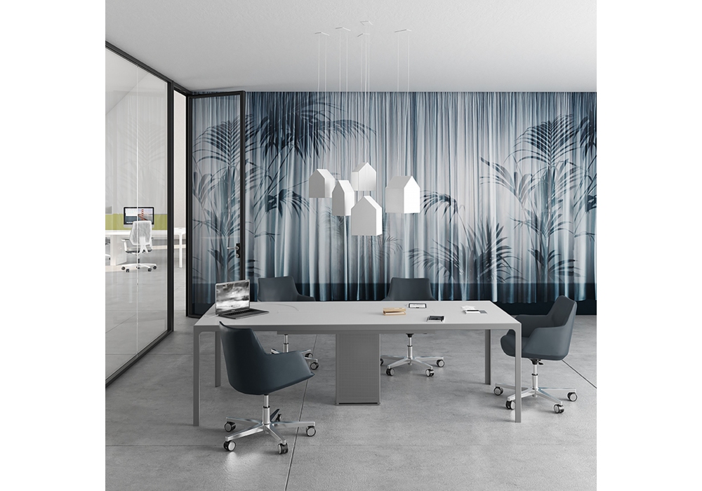 More disegnato da Estel R&D è un tavolo con gambe in metallo, proflili in alluminio e piano in laminato, essenza legno, ceramica o vetro. Disponibile in diverse finiture e dimensioni.