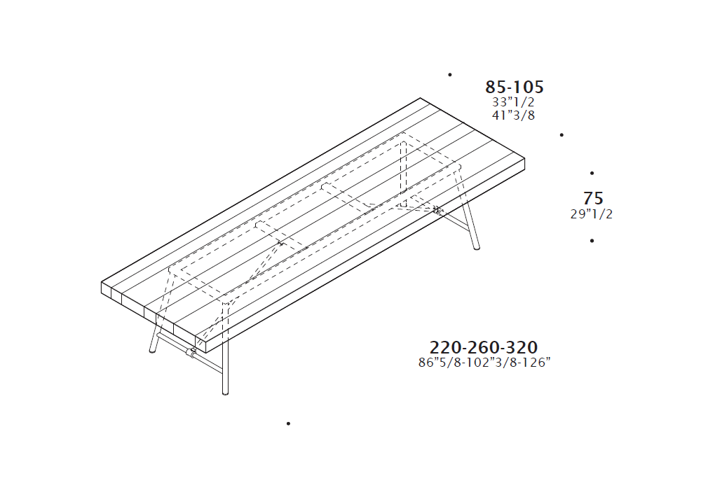 | Dimensioni | • 220 x 85 x H 75 cm; • 260 x 85 x H 75 cm; • 320 x 105 x H 75 cm; • 130 x 130 x H 75 cm; • Ø 140 x H 75 cm |